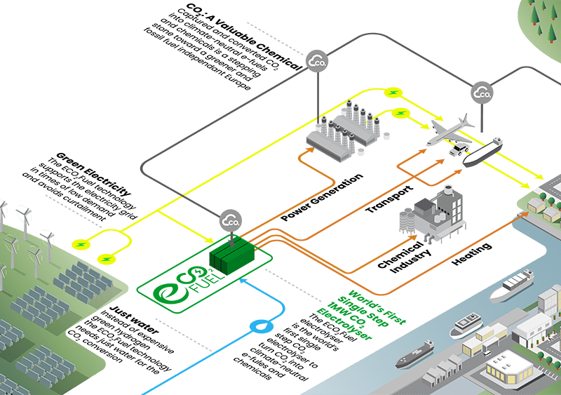 E-Fuels sind synthetisch erzeugte flüssige Kraft- und Brennstoffe auf Basis von Wasserstoff und Kohlendioxid (CO2). Sie werden mit Hilfe von erneuerbarem Strom hergestellt. Das Kohlendioxid kann aus der Luft, aus Abfallstoffen biogener Herkunft oder aus Industrieprozessen genutzt werden. So wird bei ihrer Verbrennung kein zusätzliches CO2 frei, sondern nur das, was bei ihrer Herstellung verwendet wurde. E-Fuels sind deshalb klimaneutral.